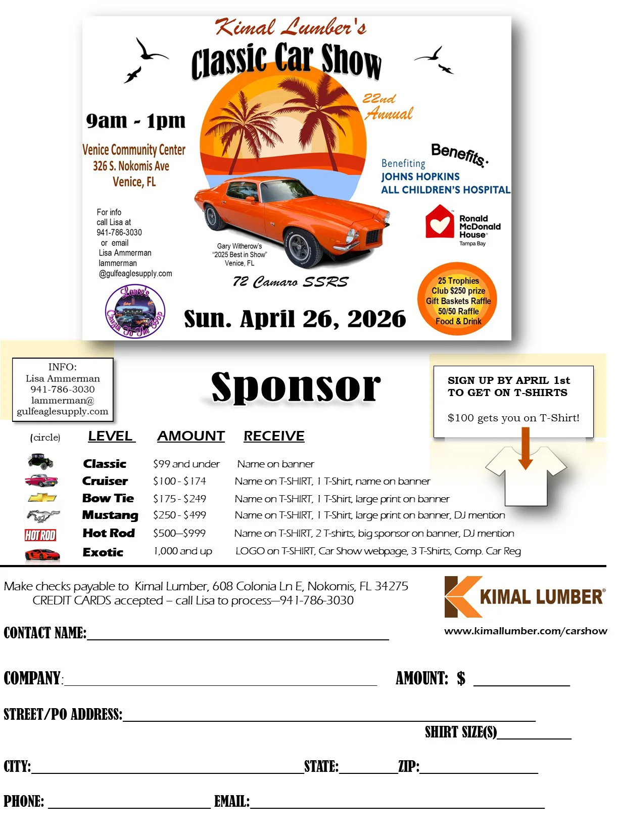 Kimal's 2026 Classic Car Show Sunday April 26th, 2026 Download/Print Registration Flyer »Register Online Here » Download/Print Sponsorship Flyer » Sponsors please print flyer, include all info, and email to lammerman@gulfeaglesupply.com Past Car Shows View 2025 Car Show Gallery View 2024 Car Show Gallery
